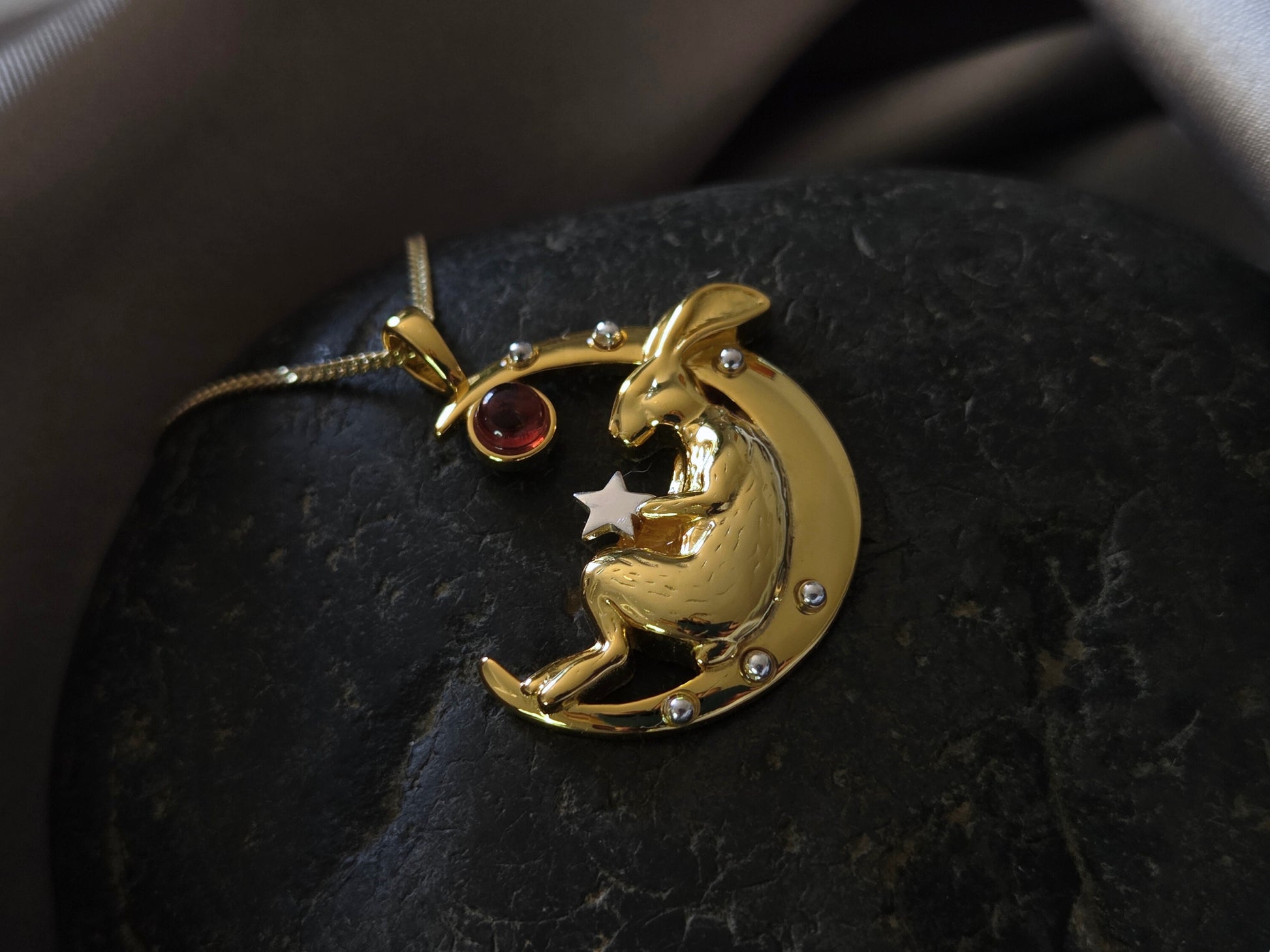 This serene bunny pendant is handcrafted in sterling silver and plated in 18K gold, capturing the tender spirit of rest and emotional sensitivity. In many cultures, rabbits represent rebirth, softness, and connection to the moon. Paired with a luminous natural moonstone, this piece embodies inner harmony, feminine energy, and deep emotional wisdom. It’s also available with garnet gemstone, known for awakening vitality, courage, and heartfelt passion — bringing grounding warmth to the spirit.