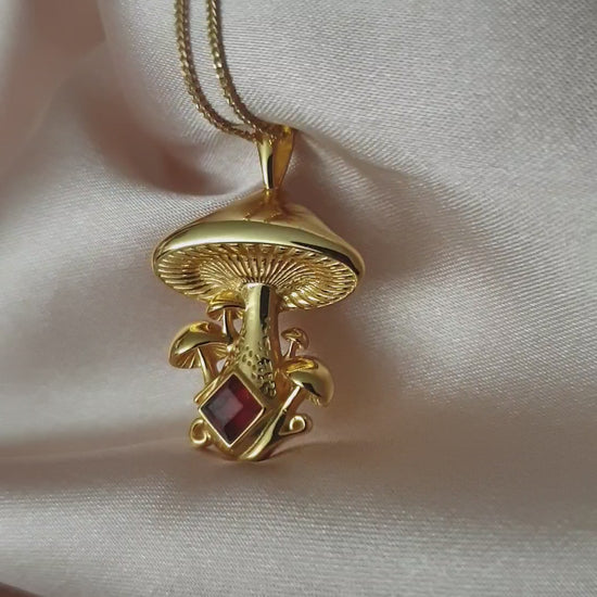Step into the enchanted forest with this mystical 18k gold-plated mushroom pendant, crowned with your choice of three natural gemstones — moonstone, garnet, or peridot.
