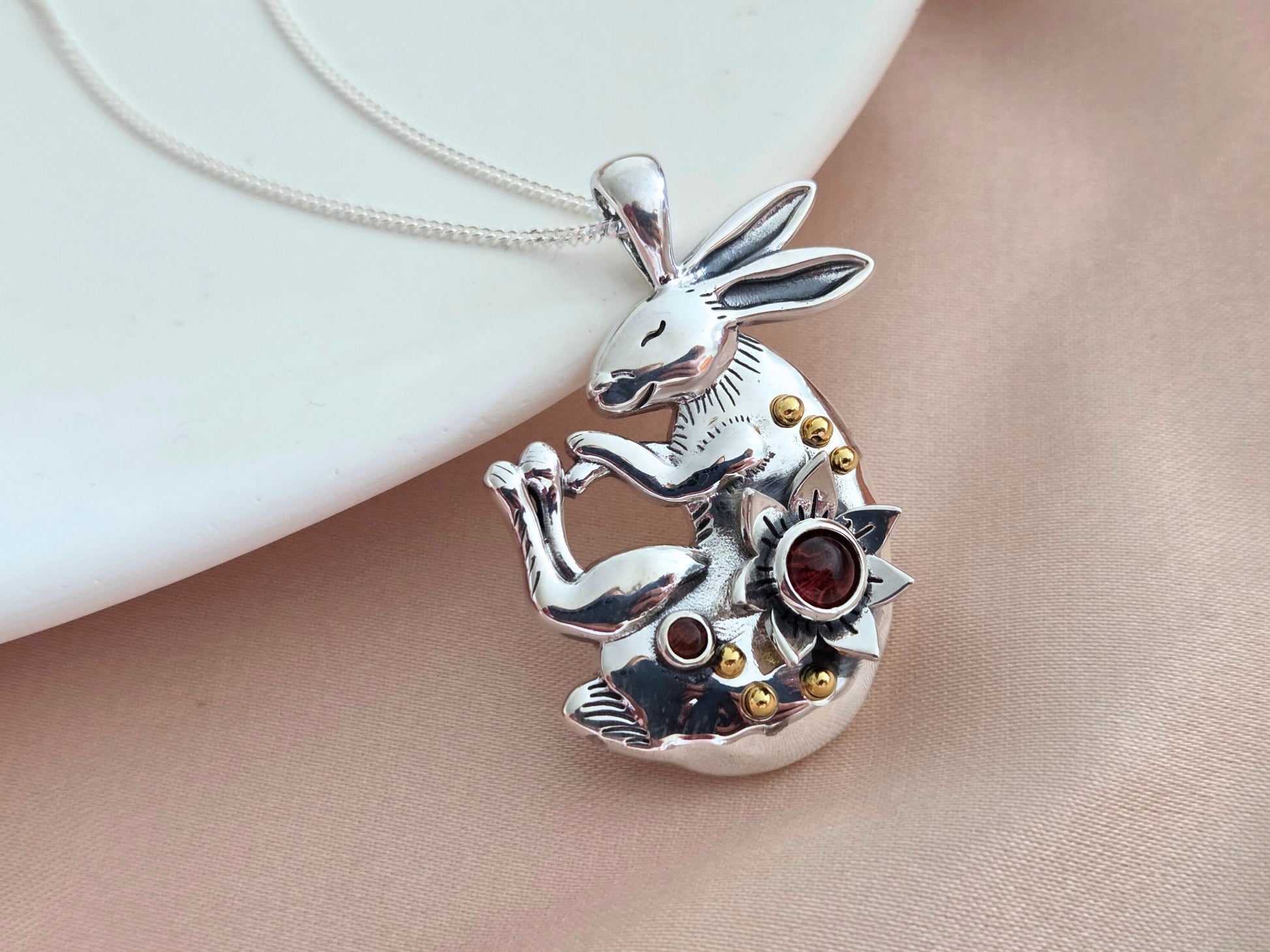 This serene bunny pendant is handcrafted in sterling silver, capturing the tender spirit of rest and emotional sensitivity. In many cultures, rabbits represent rebirth, softness, and connection to the moon. Paired with a luminous natural moonstone, this piece embodies inner harmony, feminine energy, and deep emotional wisdom. It’s also available with garnet gemstones, known for awakening vitality, courage, and heartfelt passion — bringing grounding warmth to the spirit.